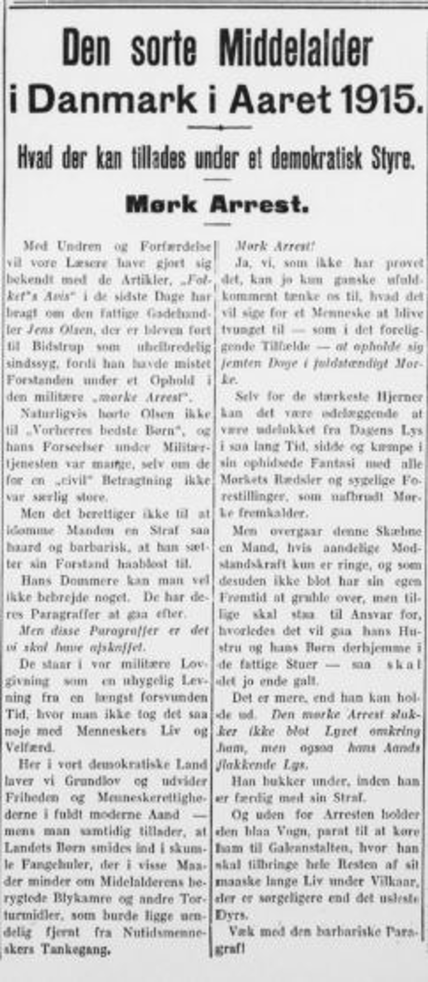 Foranlediget af at en soldat var blevet sindssyg af et 15 dage langt ophold i den mørke arrest, skrev dagbladet "Folkets Avis" d. 16. oktober 1915 en artikel om "Den sorte Middelalder i Danmark i Aaret 1915 - Hvad der kan tillades under et demokratisk Styre". Og her defineres straffen som "at opholde sig 15 dage i fuldstændigt Mørke".