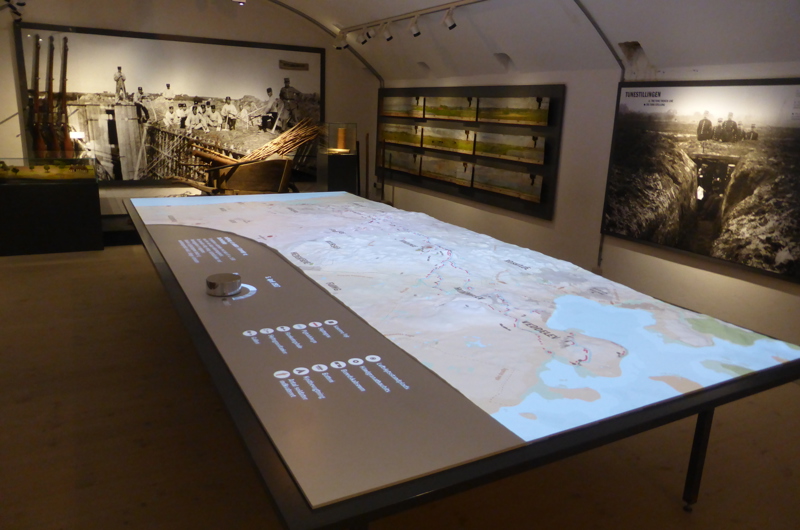 På en 5x2 meter stor terrænmodel i corian kan du spole gennem Tunestillingens historie. Der blev næsten konstant arbejdet på stillingen fra november 1915 til krigens slutning 3 år senere. Nye erfaringer fra Den Store Krig, nye strategiske overvejelser, nye mandskabsmæssige og materielle rammer førte til nye eller ændrede planer. På modellen kan du dreje dig igennem de forskellige faser. Og derefter kan du ved at trykke på modellens touchpunkter få udfoldet historierne om stillingens forskellige elementer.