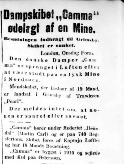 Men S/S Kamma var slet ikke nået frem til Newcastle. Skibet var sejlet fra Odense den 29. august for at hente en ladning kul i Newcastle. Få dage før var nyheden om de første danske skibes kollision med miner nået frem, og rederiet havde derfor givet skibets kaptajn, F. Løfler ordre om at sejle op under Norges kyst og derfra til Skotland i stedet for at tage den lige vej til Newcastle. Men da kaptajn Løfler var vant til at sejle den lige vej og samtidig så andre skibe tage en sydligere kurs, valgte han at se bort fra ordren.