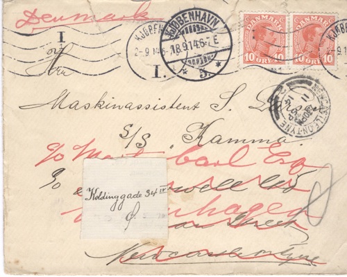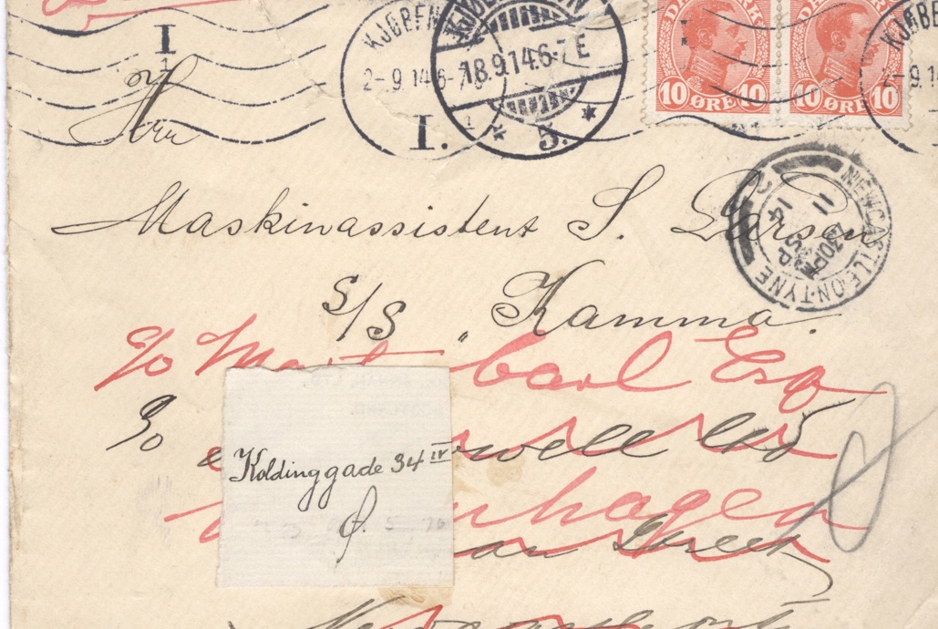 Kuverten er sendt til maskinassistent Svend Larsen på S/S Kamma på en adresse i Newcastle. Det er stemplet 2. september 1914 i København. Brevet er stemplet den 11. september i Newcastle og er derefter blevet returneret til København. Her blev det modtaget og stemplet den 18. september og forsynet med adressesedlen "Koldinggade 34 IV Ø".