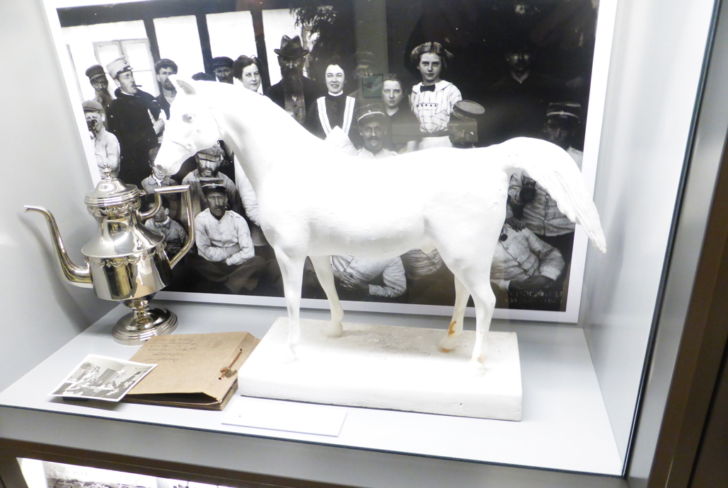 Gips-hesten blev givet som gave til Ane Marie og familien som tak for god forplejning fra de dragoner, der havde været indkvarteret på gården.