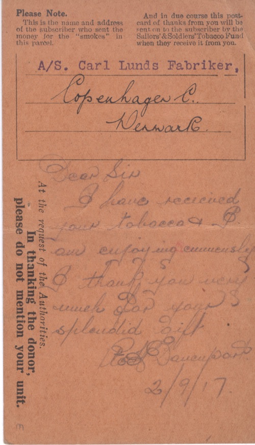 "Sailors' and Soldiers' Tobacco Fund" i London samlede ind til at købe tobak til de britiske soldater og søfolk. Med i tobak-pakkerne var et postkort, som soldaterne kunne udfylde som tak for gaven. I dette tilfælde var giveren det danske firma A/S Carl Lunds Fabrikker, der bl.a. producerede håndgranater. Modtageren (Davenport) takker for den fantastiske gave, som han nyder i fulde drag.